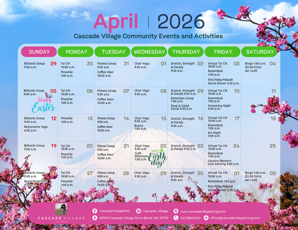 Our April 2026 Cascade Village calendar is here! Filled with community events, holiday fun, and gatherings, there's something for everyone. Be sure to check it out and join us at the clubhouse all month long for connection, creativity, and good times with neighbors.